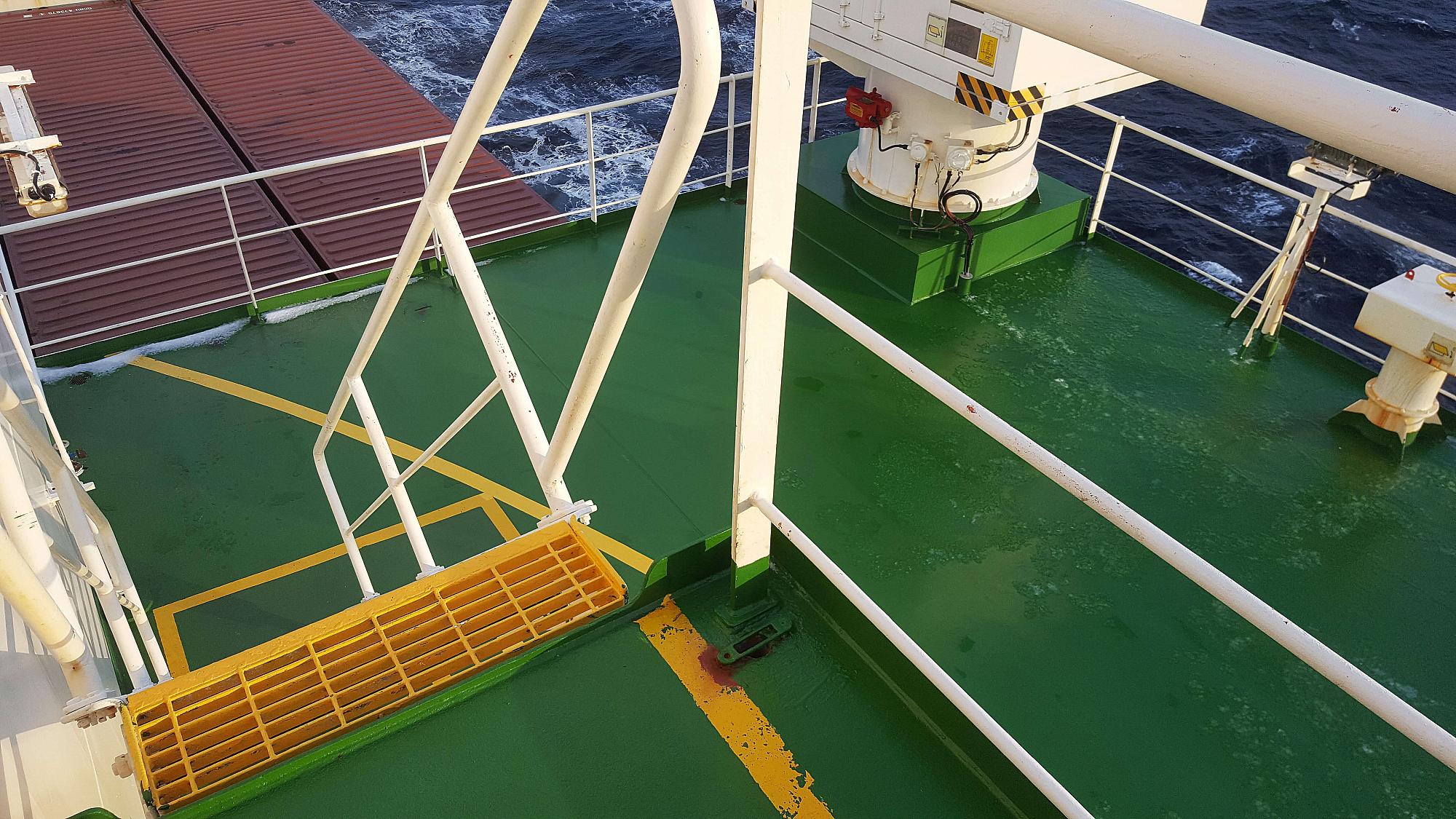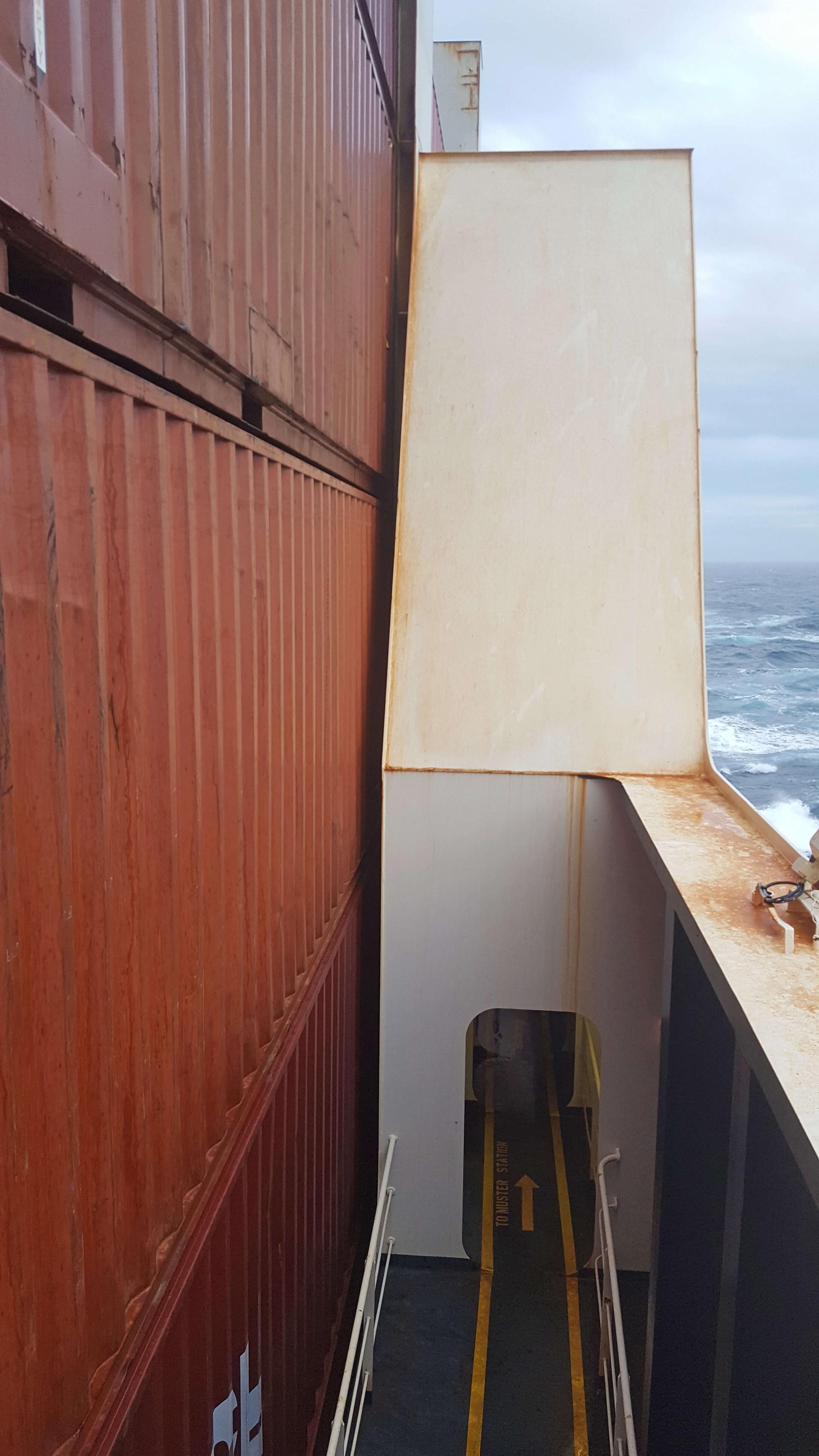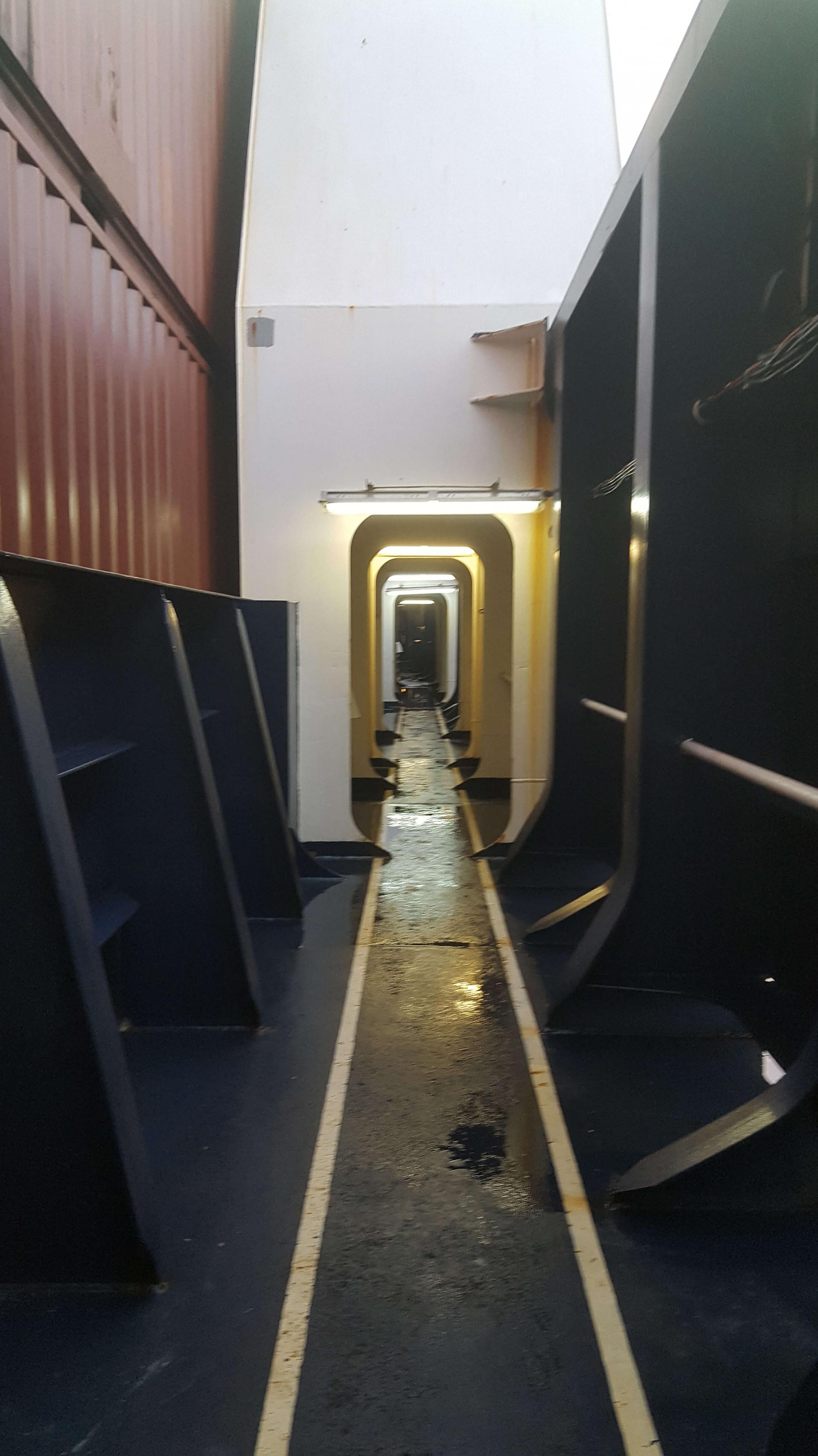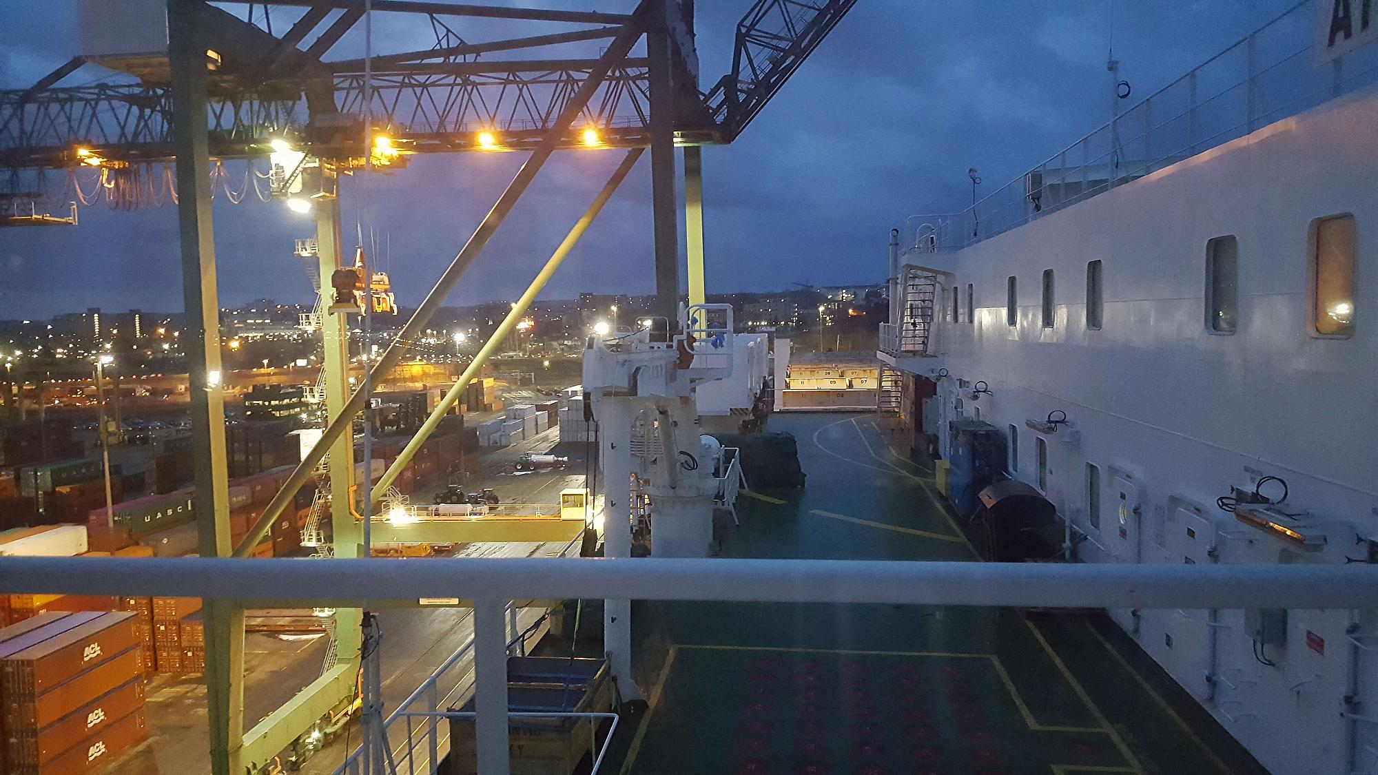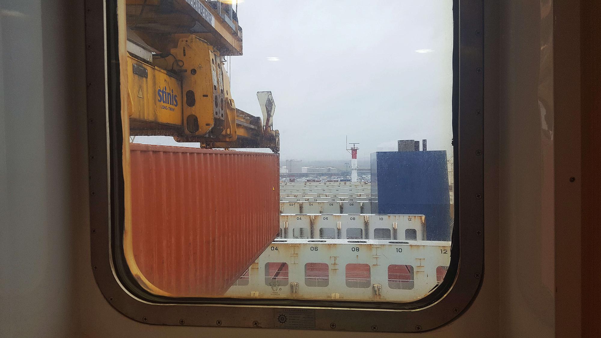 In Antwerp I could take the bus to get to the immigration (I had to go there before I could board the ship), but from there I had to take the taxi. When I arrived at the port building, they checked my ID etc. and I was driven to the ship. It looked huge! (It's almost 300 meters long, so a bit larger that the Titanic. They said it's a small cargo ship, though). Then I was told to just walk up the ramp on to the ship, just a few seconds later they thought that's probably too dangerous (why...?) and so I got into another car that drove me up the ramp. There I was welcomed by a crew member and brought to my cabin. The ship is one big maze, I would not even have been able to find the way out by myself... On the way they showed me were the mess room is, that's also where we ate. They told me that lunch will be at 12:30 and left me in my cabin, so I had lots of time to watch the containers being loaded on the ship. At lunch I met my fellow passenger Viki, who is a bit younger than me and from Austria. She was a great ship travel buddy.