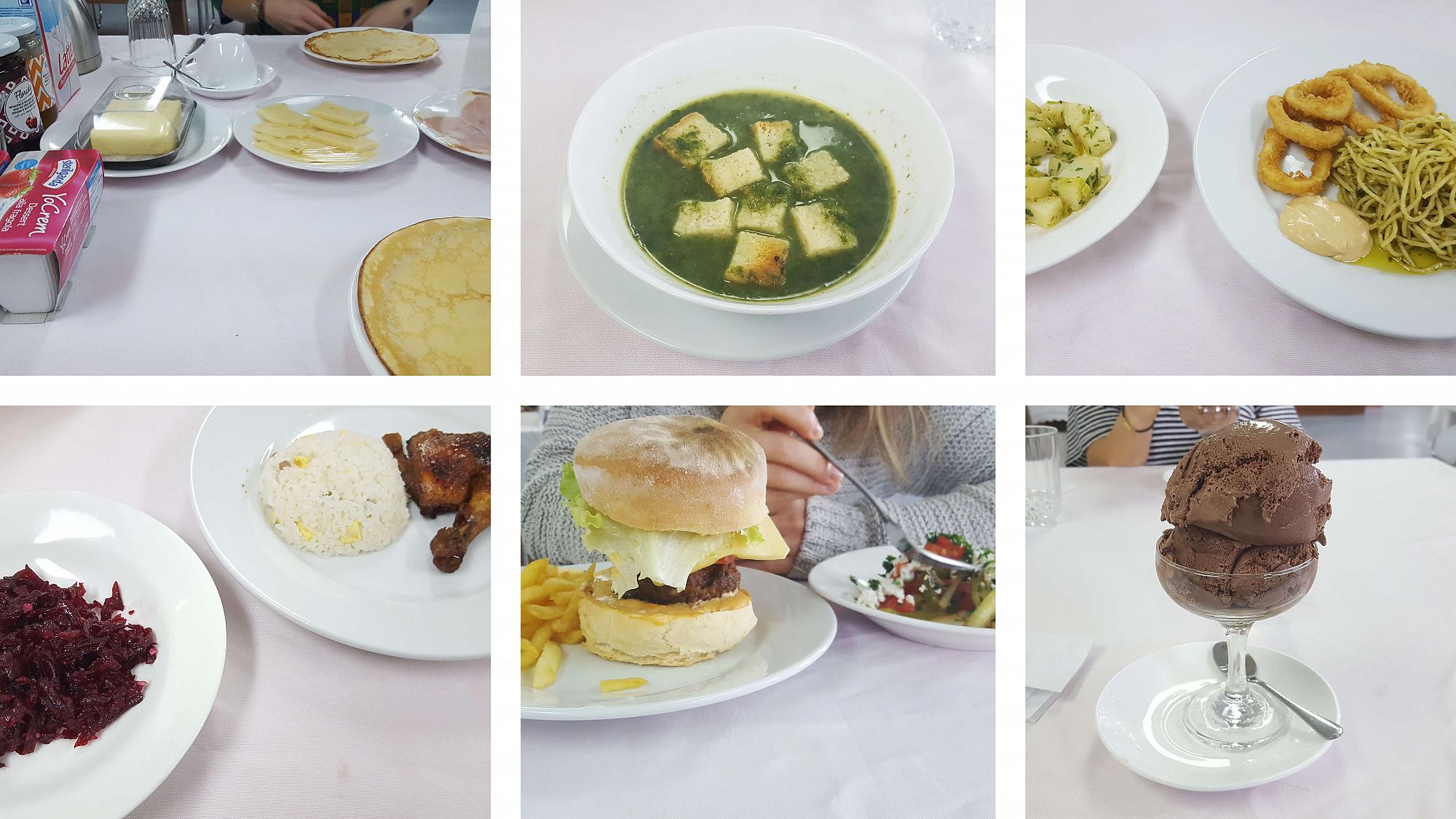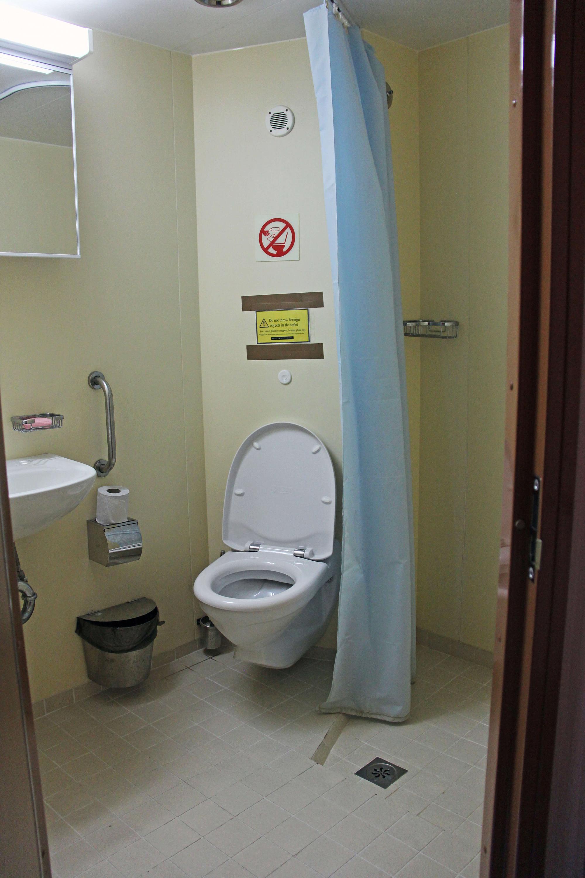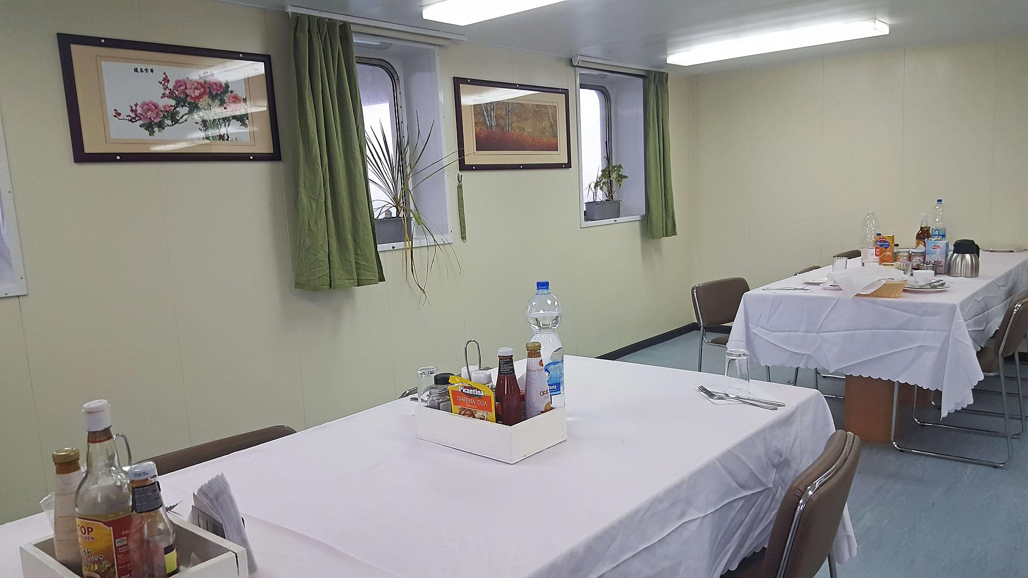 I have some photos of the food below. For breakfast there was always toast (usually with jam) with butter, cheese, meat slices, coffee, tea, milk, juice, eggs, etc. My favourite breakfast was pancakes (which more looked like an omelet) which we got 2 or 3 times. Lunch was usually starting with a soup or salad, then a main dish with meat, and most of the times a dessert (fruits, cake, and on Sundays: ice cream). For dinner also a salad and a main dish with meat. I am usually a vegetarian, but I wasn't sure how much of "complaining" about the food was still ok, so after we already asked for smaller portions, I thought I'm just gonna go with whatever they serve me. Although even the travel agency had told me it would not be a problem to ask them. Maybe next time. Generally the portions were huge, even after we got smaller ones. So I was never ever hungry and didn't even eat the snacks I had brought on the ship. ;-) The food was not bad (I guess it looks quite good on the photos, but I generally took more photos of the food I liked), still for some reason I could not really enjoy all of it, it was not my taste (from some of it I felt like I would have to throw up, and it wasn't because of seasickness), I believe it's the Asian or seafood parts of it. But it's food, so it's ok, and lots of it actually was good ;-)) The crew gets more or less the same food as the passengers, but the passengers (and captain, officers, …) are being served at the table.